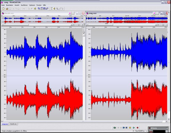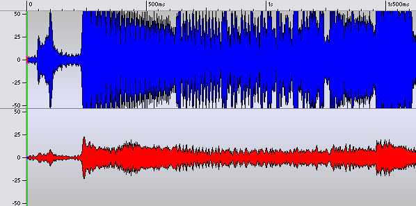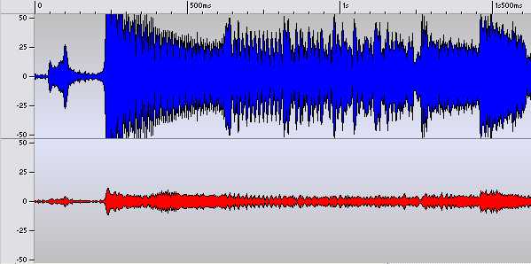 Um einen Hit in die Charts zu bringen muss er auffallen. Vor allem im Radio. Hier fällt man am besten mit Lautstärke auf. Ziel ist also das eigene Musikstück lauter, oder zumindest nicht leiser, erscheinen zu lassen als die Anderen. Hier kommen Kompressoren zum Einsatz. Wie der Name schon sagt wird hier komprimiert, nämlich die Dynamik (einfach Ausgedrückt der Unterschied zwischen dem leisesten und dem lautesten Ton). Komprimierung heißt, dass hohe Pegel etwas abgesenkt und gleichzeitig niedrige Pegel etwas angehoben werden. Dadurch wird das ganze Spektrum gestaucht und kann dann insgesamt höher ausgesteuert werden. Die unten stehenden Bilder zeigen das Ergebnis einer 3:1 - Kompression. Im ersten Bild erkennen wir das Original, im zweiten das Ergebnis des Kompressors (Die Farben blau und rot markieren jeweils den linken und rechten Kanal).