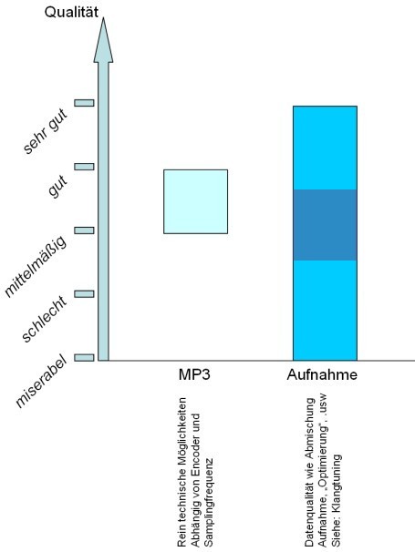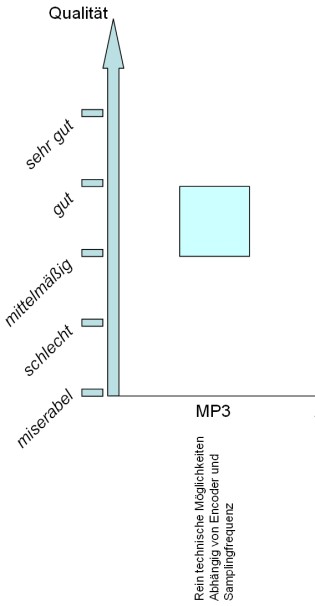 Wie das Bild zeigt, sehe ich ein MP3 File nicht als schlecht an. Es bewegt sich, abhängig vom verwendeten Encoder und der Samplingfrequenz, in einem Bereich von mittelmäßig bis gut. Diese Einschätzung bezieht sich nur auf die technischen Möglichkeiten der MP3 - Codierung. Ein MP3 einer schlechten Quelle wird durch das encoden nie besser, genauso wie eine sehr gute Vorlage nie sehr gut bleiben wird wenn ich sie codiert habe.