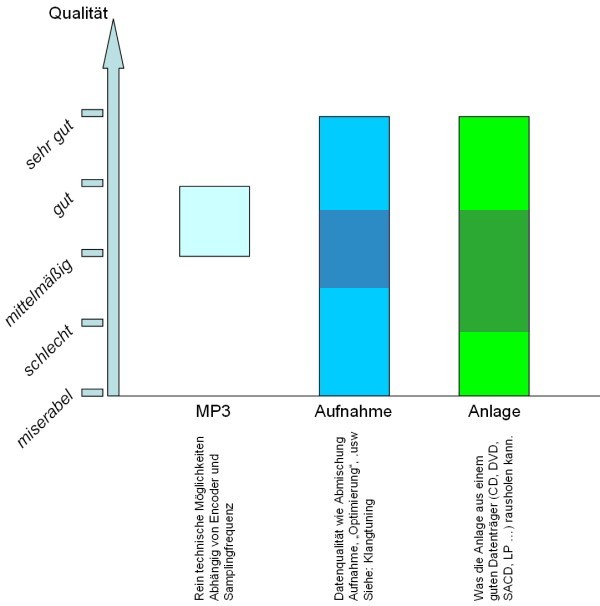 Alleine aus obiger Grafik lässt sich leicht ableiten warum so viele der Ansicht sind, dass ein MP-3 die Qualität nicht verschlechtert. Die üblichen Quellmedien liegen, bezüglich der Aufnahmequalität, einfach weit unter dem technisch Machbaren. Aber noch ein weiterer Aspekt kommt hinzu. Die Anlage.